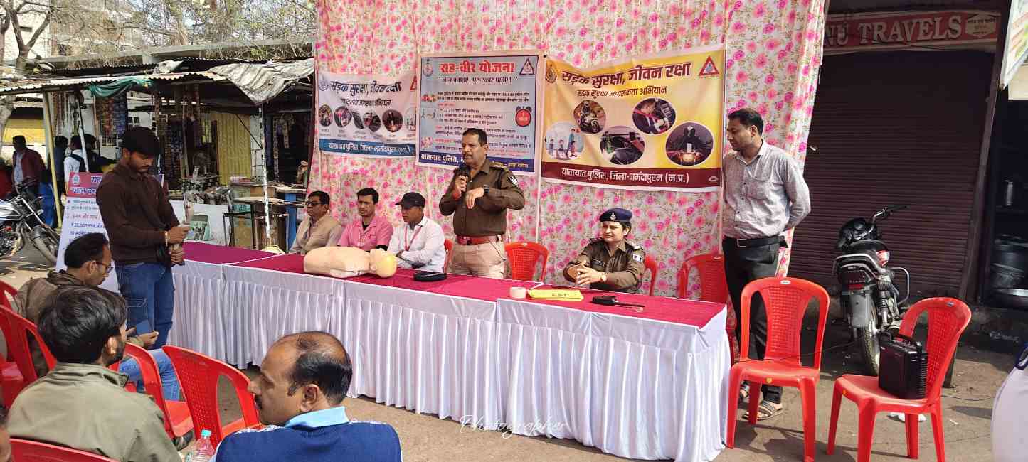 इसी क्रम में आज यातायात पुलिस नर्मदापुरम द्वारा बस स्टैंड नर्मदापुरम में डीएसपी यातायात संतोष मिश्रा, निरीक्षक सुनीता पटेल, पुलिस अस्पताल के प्रधान आरक्षक राकेश रघुवंशी एवं नर्मदा अस्पताल के कमल राजपूत, साबिर खान और रामकिशन के सहयोग से बस स्टैंड पर प्रशिक्षण आयोजित किया गया और सीपीआर ट्रेनिंग, फर्स्ट एड, दुर्घटना में पीड़ितो बचाव के दौरान सावधानी और राहवीर, हिट एंड रन, कैशलैस उपचार योजना के संबंध में अवगत कराया गया, उक्त कार्यक्रम समयबद्ध तरीके से अलग अलग स्थानों पर चलाया जा रहा है ताकि लोग इसका लाभ उठा कर जागरूक सहयोगी बनें साथ ही साथ यातायात नियमों के प्रति जागरूक हो ।