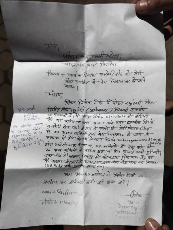 पिपरिया – पिपरिया के मंगलवारा थाना क्षेत्र के अंतर्गत हथवास निवासी अधिवक्ता मोहन सिंह रघुवंशी का बैग अज्ञात आरोपी चोरी कर चंपत हो गए, अधिवक्ता संघ के अध्यक्ष धर्मेंद्र सिंह नागवंशी को जानकारी मिलते ही अपनी टीम के साथ थाने पहुंचे ।
